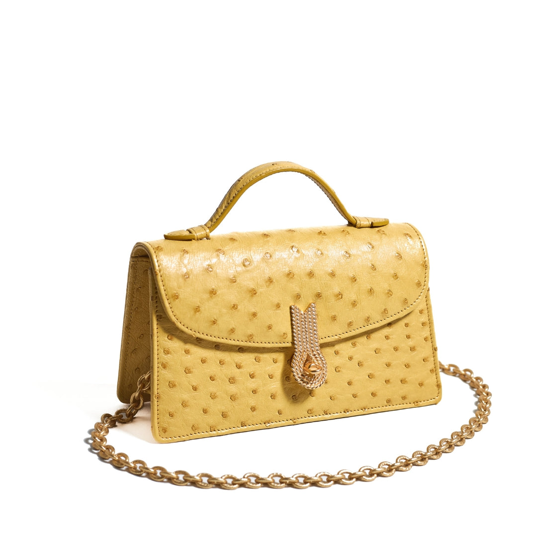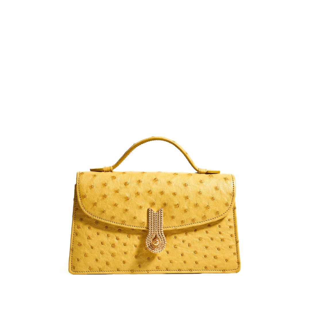 Mini borsa a mano in pelle tinta unita fuxia con patta sagomata arricchita da chiusura in ottone.