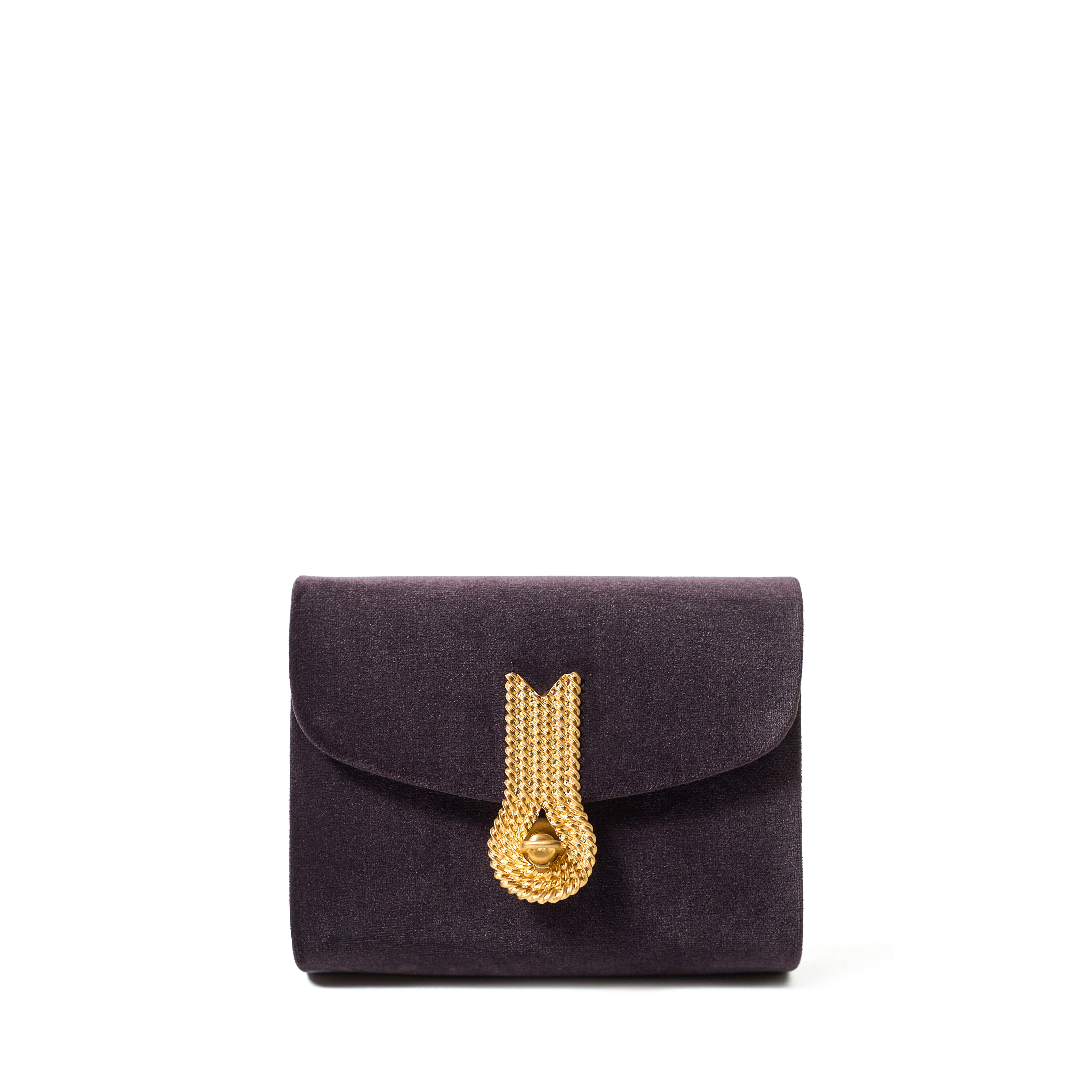 Micro belt bag in velvet cioccolato. Enriched with iconic "Cometa" turnlock closure in brass plated matte gold.